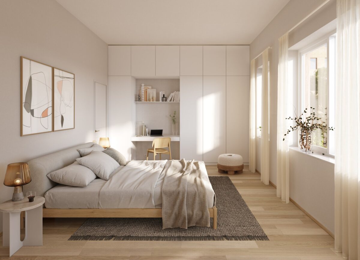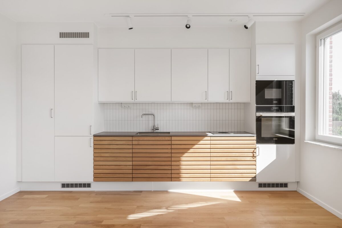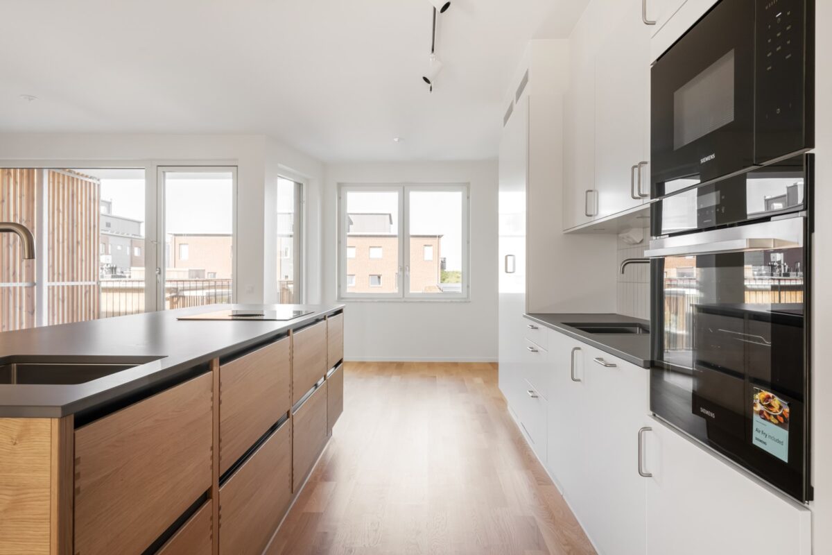 Lägenheterna är praktiskt indelade med stora sociala ytor runt kök och vardagsrum. De stora balkongerna blir en viktig del av de sociala ytorna. Tack vare de breda glasdörrarna kan gränsen mellan balkong och vardagsrum ibland suddas ut. Husets samtliga lägenheter som är större än två rum är genomgående från gata till gård. Många har dessutom ljus från ytterligare ett håll. På sådana sätt gör vi så att livet inne i huset blir så bra som möjligt.